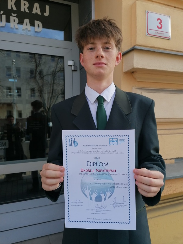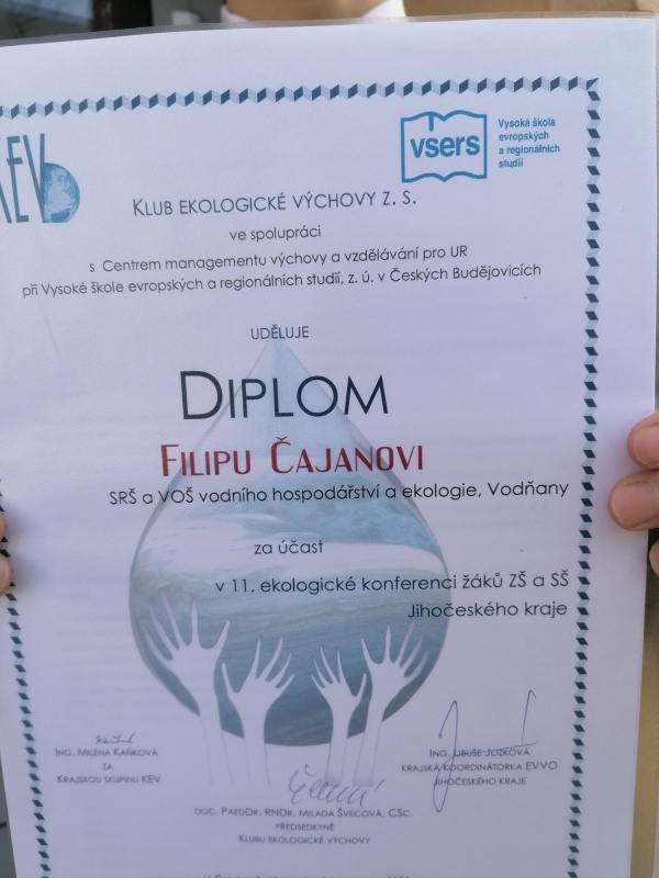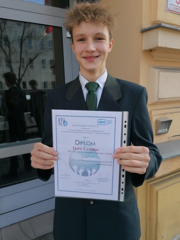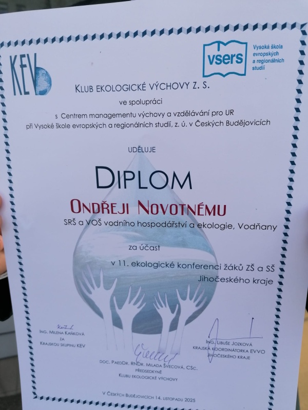Dne 14. 11. 2025 naši žáci Ondřej Novotný a Filip Čajan z 2. ročníku Chovu ryb úspěšně reprezentovali naši školu na 11. ročníku Ekologické konference žáků ZŠ a SŠ Jihočeského kraje v Českých Budějovicích. Vystoupili s názvem příspěvku „Působení nepůvodních druhů ryb a ostatních živočichů na rybí společenstva.“ Konference byla pořádána Klubem ekologické výchovy ve spolupráci s jihočeskou skupinou KEV, VŠERS a KÚ Jihočeského kraje.