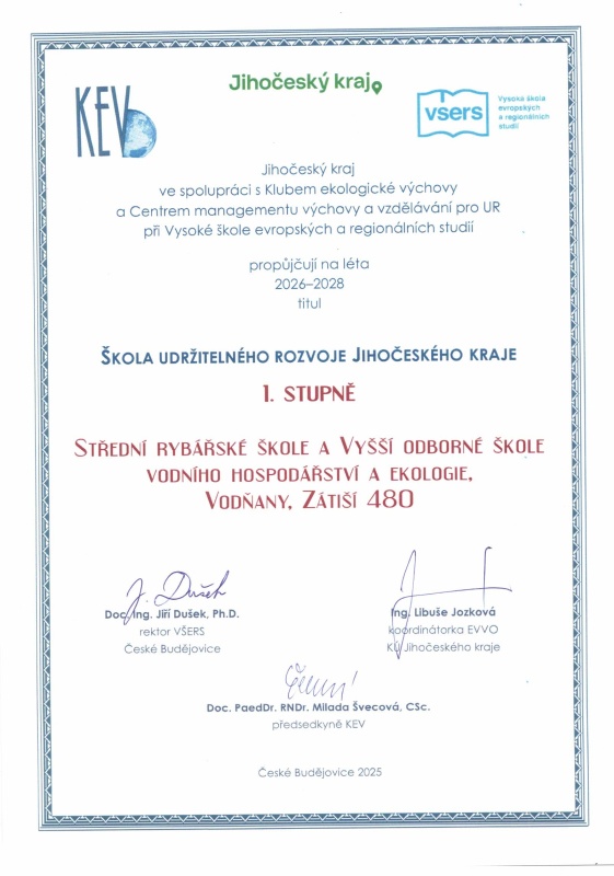 Na 16. setkání koordinátorů environmentální výchovy Jihočeského kraje, které se uskutečnilo v rámci mezinárodní konference Udržitelný rozvoj XVI, dne 17. října 2025 na Krajském úřadě v Českých Budějovicích, byl naší škole na léta 2026–2028 propůjčen titul Škola udržitelného rozvoje Jihočeského kraje 1. stupně.